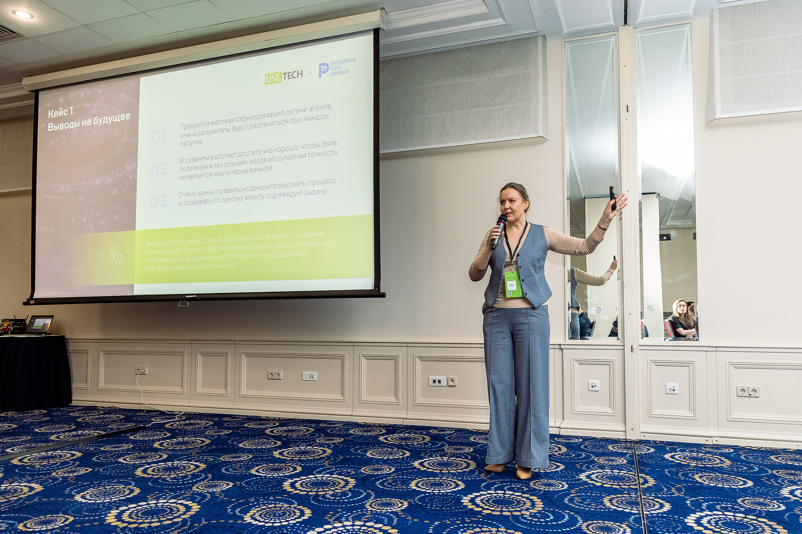 Стартовала деловая программа с доклада Ольги Барановой, директора направления «Консалтинг и ИТ аудит», ГК «Юзтех». Ольга поделилась практикой внедрения и использования ИИ‑агентов в промышленной среде. В ходе встречи участники детально обсудили ряд практических кейсов: мониторинг и анализ конкурентной среды, оптимизация рецептуры лакокрасочных материалов, управление утилизацией отходов.